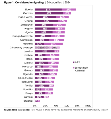 - Thoughts of emigrating are most common in Liberia (78%), the Gambia (68%), Cabo Verde (64%), and Ghana (61%). In contrast, very few Tanzanians (9%) express an interest in leaving.